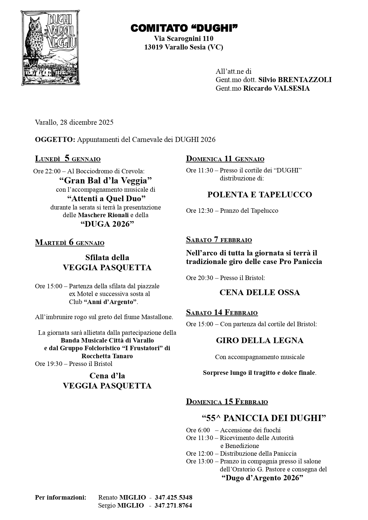 Il 15 febbraio alle ore 6.00 accensione dei fuochi, ore 11.30 ricevimento autorità e benedizione dei calderoni, ore 12 distribuzione della Paniccia e alle 13 pranzo in compagnia presso l’Oratorio G Pastore e consegna del Dugo d’Argento 2026