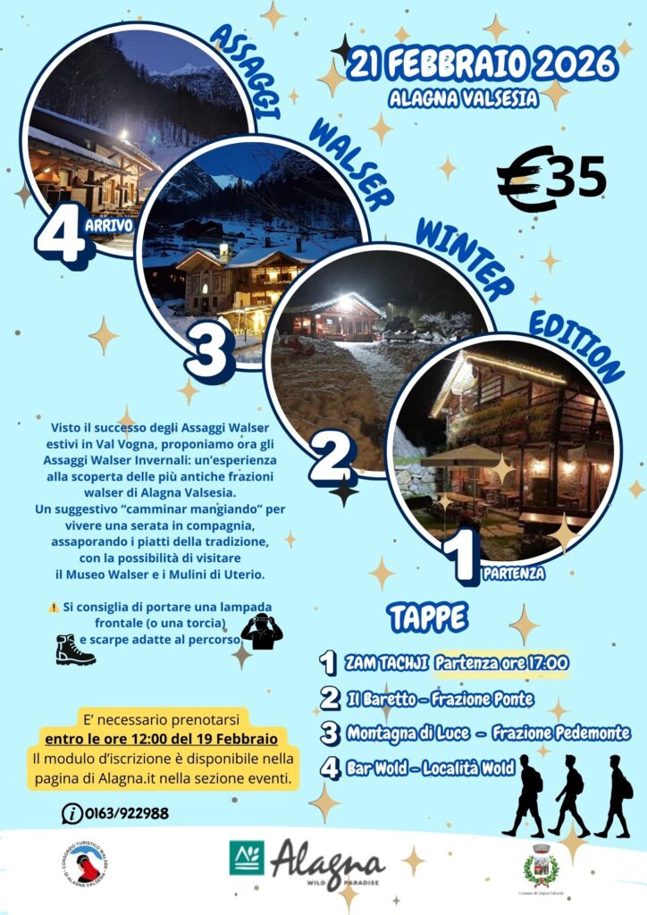 Un suggestivo “camminar mangiando” per vivere una serata in compagnia, assaporando i piatti della tradizione, con la possibilità di visitare il Museo Walser e i Mulini di Uterio. Si consiglia di portare una lampada frontale (o una torcia) e scarpe adatte al percorso. È necessario prenotarsi entro le ore 12:00 del 19 Febbraio.