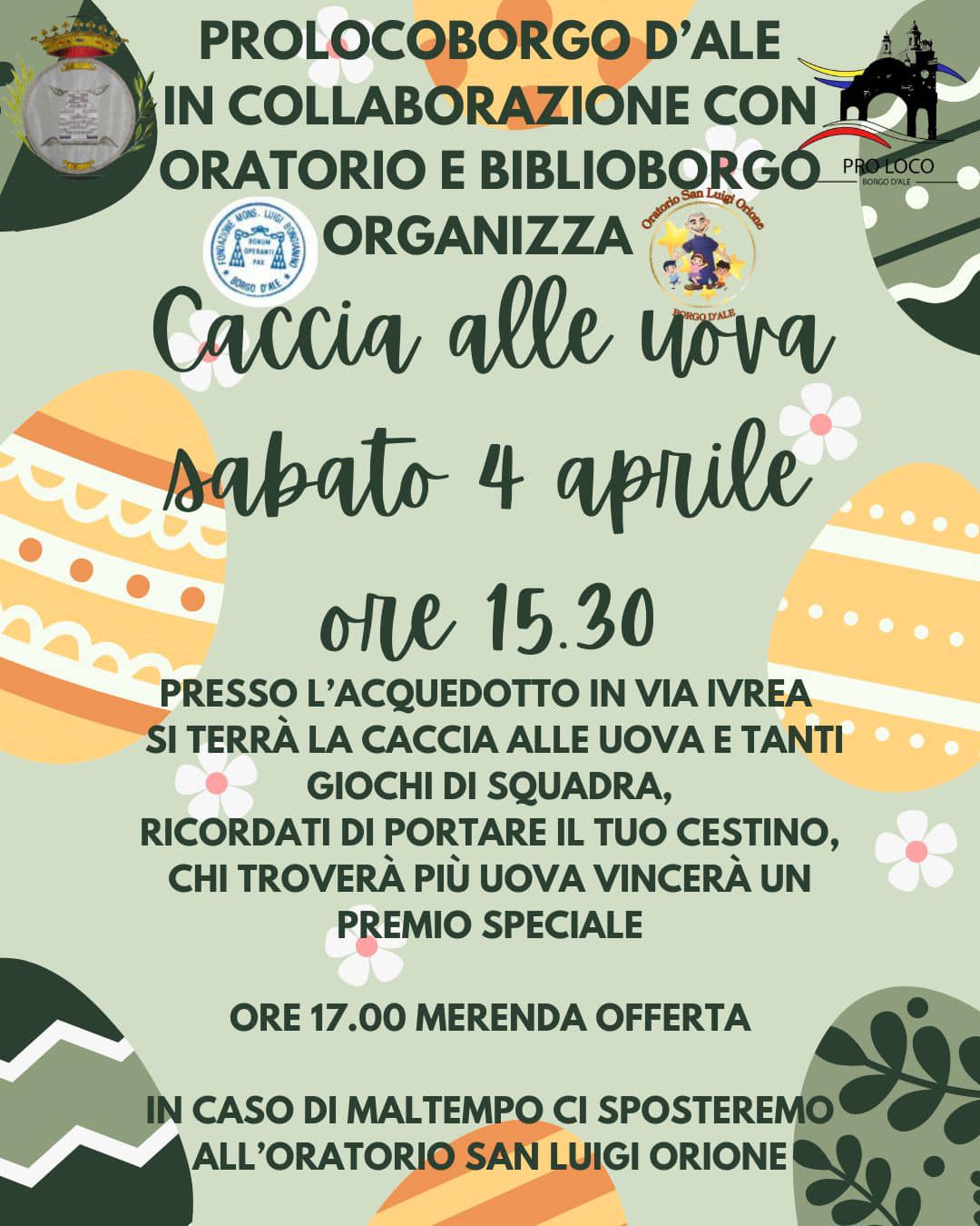 Sabato 4 aprile, alle ore 15.30, presso l’acquedotto di via Ivrea, la caccia alle uova e tanti giochi di squadra. Alle 17.00 merenda offerta.