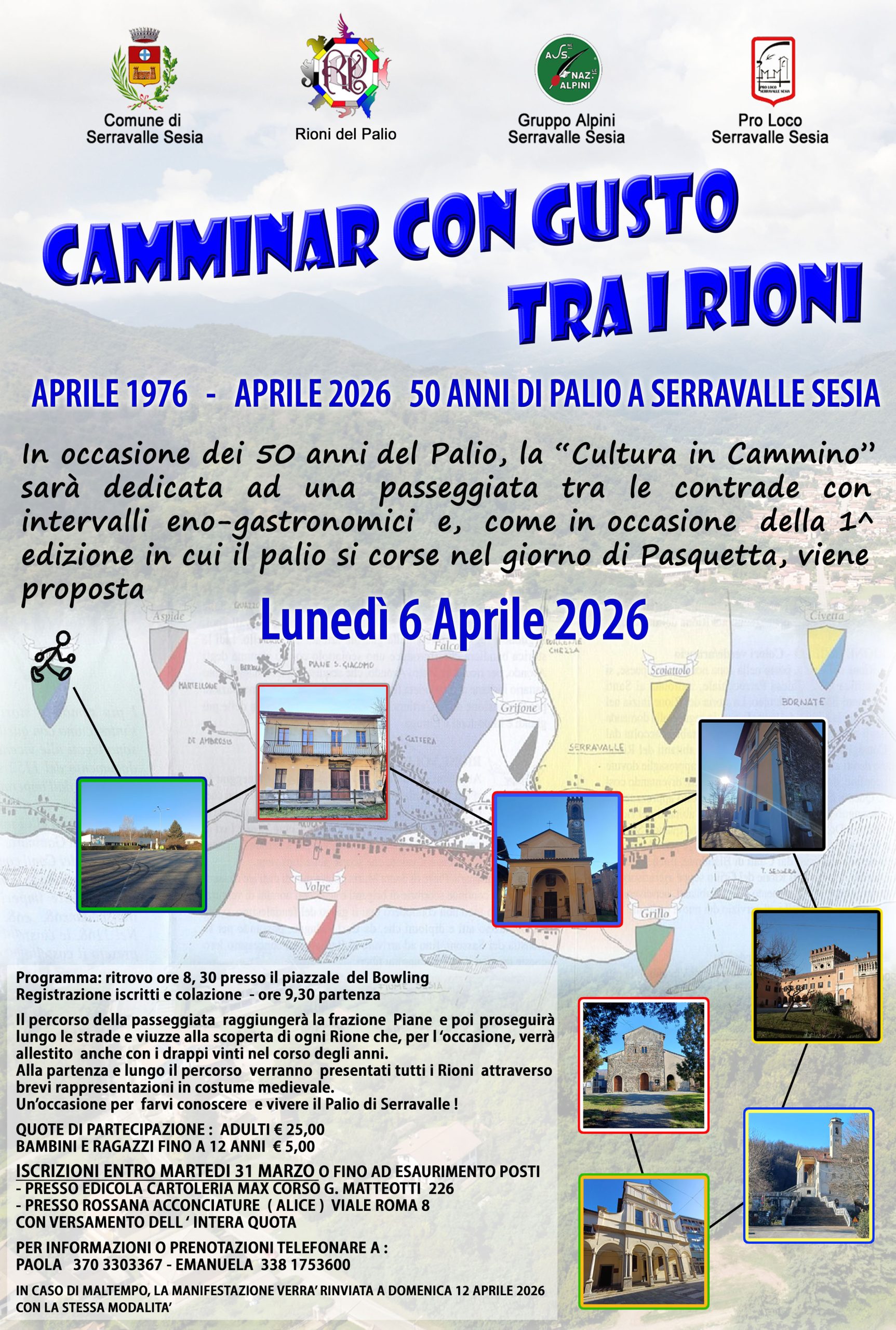 In occasione dei 50 anni del Palio, la Cultura in Cammino sarà dedicata ad una passeggiata tra le contrate con intervalli enogastronomici e, come in occasione della Prima Edizione in cui il Palio si corse nel giorno di Pasquetta, viene proposta nella stessa giornata. Lunedì 6 aprile 2026 con ritrovo ore 8.30 presso il piazzale del Bowling di Serravalle Sesia. Iscrizioni entro il 31 marzo 2026.