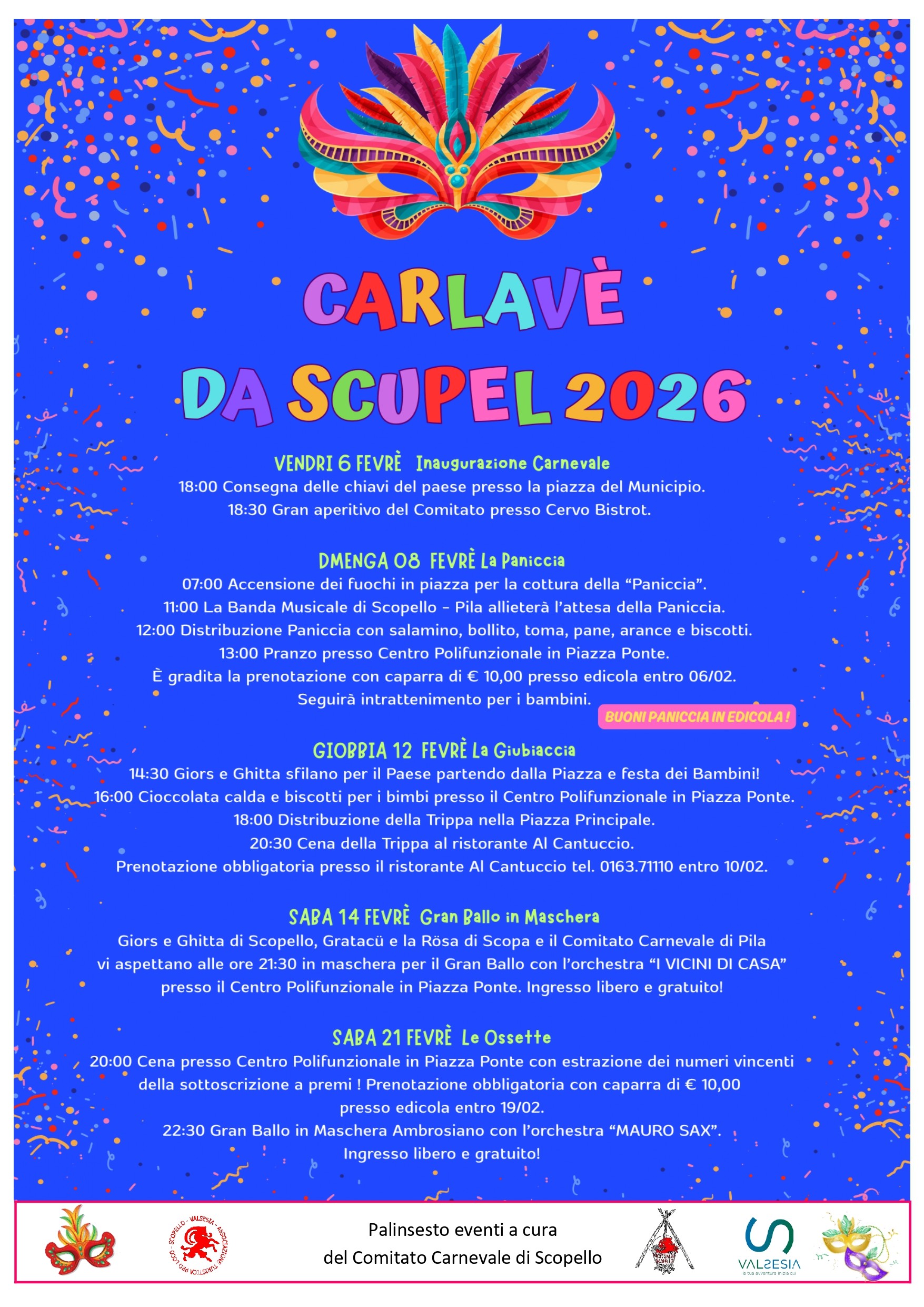 Alle 07.00 accensione dei fuochi in piazza per la cottura della Paniccia. Dalle ore 11.00 la Banda Musicale di Scopello e Pila allieterà l’attesa della distribuzione della paniccia. Dalle 12.00 si inizierà la distribuzione della paniccia con: salamino, bollito, fetta di toma, pane, arance e biscotti. I buoni paniccia sono in vendita presso l’edicola e domenica mattina anche presso la casetta degli alpini. Alle 13.00 presso il Centro Polifunzionale, il Comitato Carnevale organizza il pranzo e vi aspetta numerosi. E’ gradita la prenotazione con caparra di € 10,00 presso edicola entro il 06 febbraio.