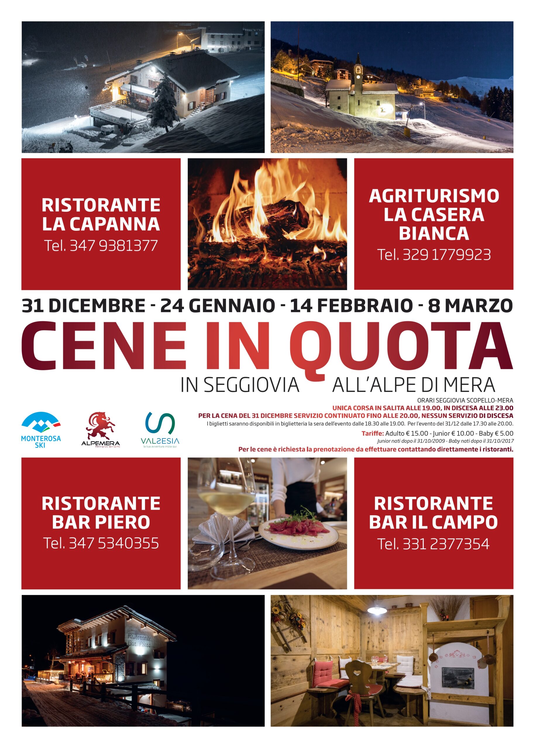 Info e prenotazioni: RISTORANTE LA CAPANNA: la.capannadimera@gmail.com / 347 9381377 AGRITURISMO LA CASERA BIANCA: ferrarismariaantonietta@yahoo.it / 329 177 9923 RISTORANTE BAR PIERO: cinziafl@gmail.com / 347 5340355 RISTORANTE BAR IL CAMPO: nicolecapizzi96@gmail.com / 331 2377354