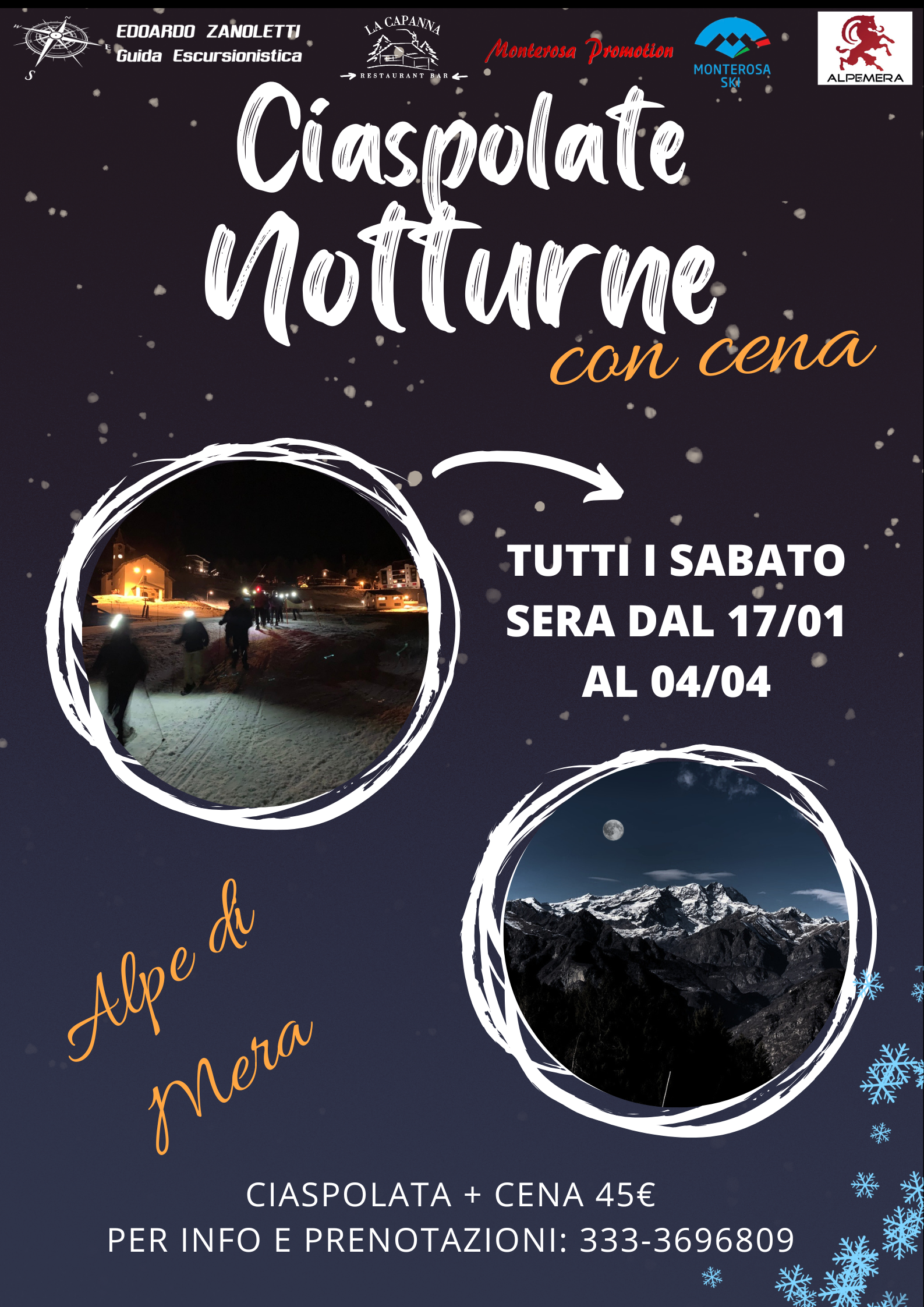 Tutti i sabati sera dal 17 gennaio al 4 aprile saranno organizzati una serie di appuntamenti serali per ciaspolare all’Alpe di Mera, ammirando la valle sottostante punteggiata dalle luci dei suoi paesi e gustando un’ottima cena. Possibilità di noleggio: kit ciaspole (ciaspole + bastoncini) e della luce frontale. Prenotazioni entro le 12 del venerdì precedente.