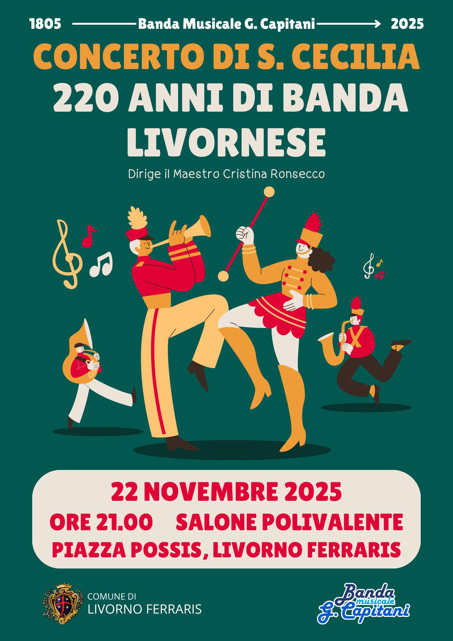 Sabato 22 novembre ore 21 al Polivalente di Livorno Ferraris il concerto di S.Cecilia con la Banda musicale G.Capitani in occasione dei 220 anni dalla fondazione della medesima.