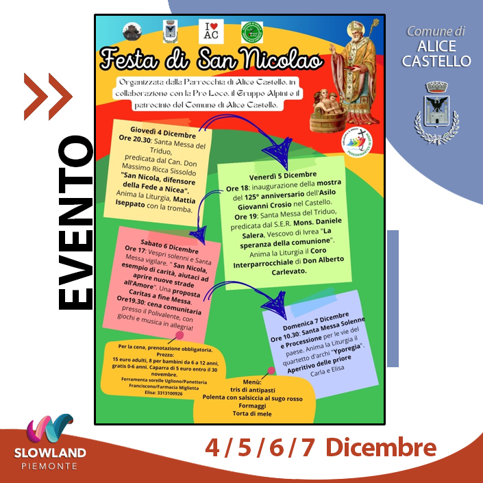 Da giovedì 4 a domenica 7 dicembre, la Festa di San Nicolao ad Alice Castello: un ricco programma di celebrazioni, musica, tradizioni e momenti conviviali.
