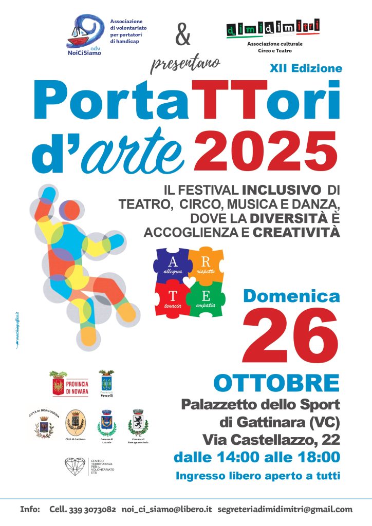 Domenica 26 ottobre, dalle ore 14.00 alle 18.00, presso il palazzetto dello sport in via Castellazzo 22 a Gattinara si svolegerà la dodicesima edizione del Festival di Arte e Teatro PortaTTori d’Arte presentato dall’Associazione di volontariato per portatori di handicap Noi ci Siamo ODV di Lozzolo (VC), in collaborazione con l’Associazione Culturale Circo e Teatro Dimidimitri di Novara. Sul palco si alterneranno Le compagnie teatrali “I Matrioski” di Gattinara e “I Con-Centrati (Teatranti Alternativi)” del Centro Diurno di Oleggio, le danzatrici e i danzatori della Scuola IncontrArti_asd di Borgosesia e del Liceo Coreutico F. Casorati di Novara e gli acrobati e artisti circensi Miniclown e Akropazzi della Dimidimitri. Ingresso libero.