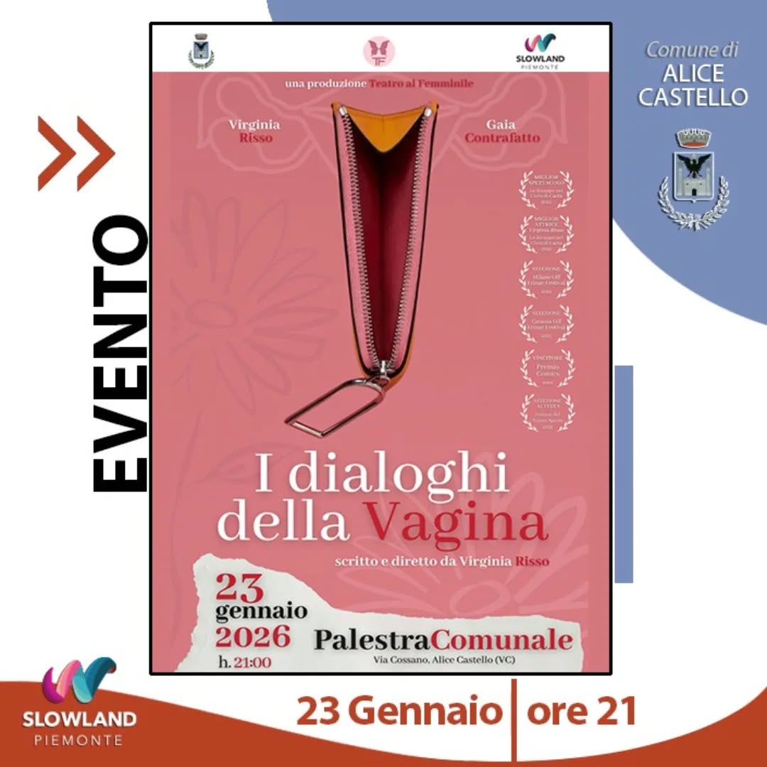 Venerdì 23 gennaio, alle ore 21, presso la Palestra Comunale di Alice Castello, lo spettacolo “I dialoghi della vagina”, scritto e diretta da Virginia Risso, con Gaia Contraffatto.