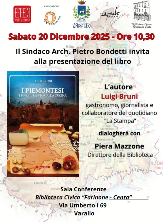 Sabato 20 dicembre 2025 a Varallo, presso la Biblioteca Civica “Farinone-Centa”, alle ore 10.30, sarà presentato il volume curato da Luigi Bruni, gastronomo, giornalista e collaboratore del quotidiano La Stampa: I Piemontesi. I popoli, la storia, la cucina. Interverrà l’Autore che dialogherà con Piera Mazzone, direttore della Biblioteca Civica.