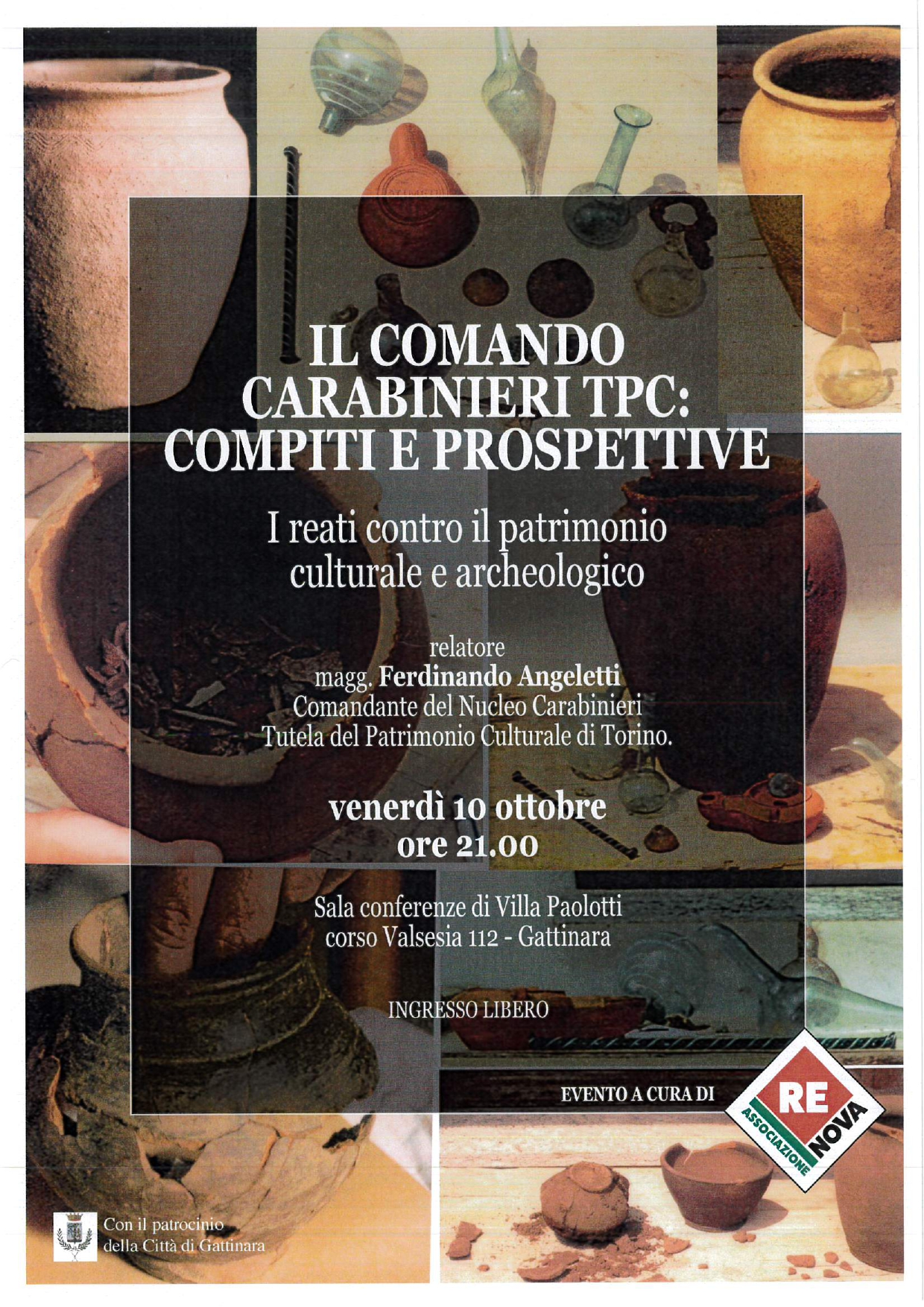 Venerdì 10 ottobre alle ore 21.00 presso la sala conferenze di Villa Paolotti il maggiore Ferdinando Angeletti, comandante del nucleo carabinieri Tutela del Patrimonio Culturale di Torino, relazionerà sui reati contro il patrimonio culturale e archeologico e sui compiti e le prosepttive da parte del comando dei carabinieri