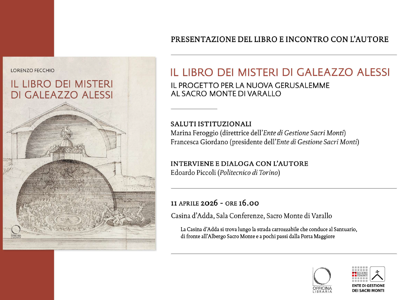 Sabato 11 aprile alle ore 16.00 presso Casina d’Adda, Sala Conferenze presso il Sacro Monte di Varallo sarà presentato il libro dei misteri di Galeazzo Alessi. Interviene e dialoga con l’autore Edoardo Piccoli del politecnico di Torino.