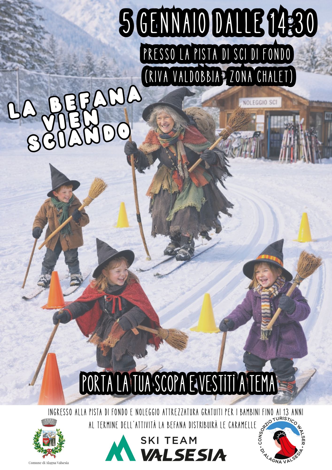 Lunedì 5 gennaio dalle ore 14.30 presso la pista di sci di fondo di Riva Valdobbia – zona chalet porta la tua scopa e vestiti a tema! Ingresso alla pista di fondo e noleggio attrezzatura gratuiti per bambini fino ai 13 anni.