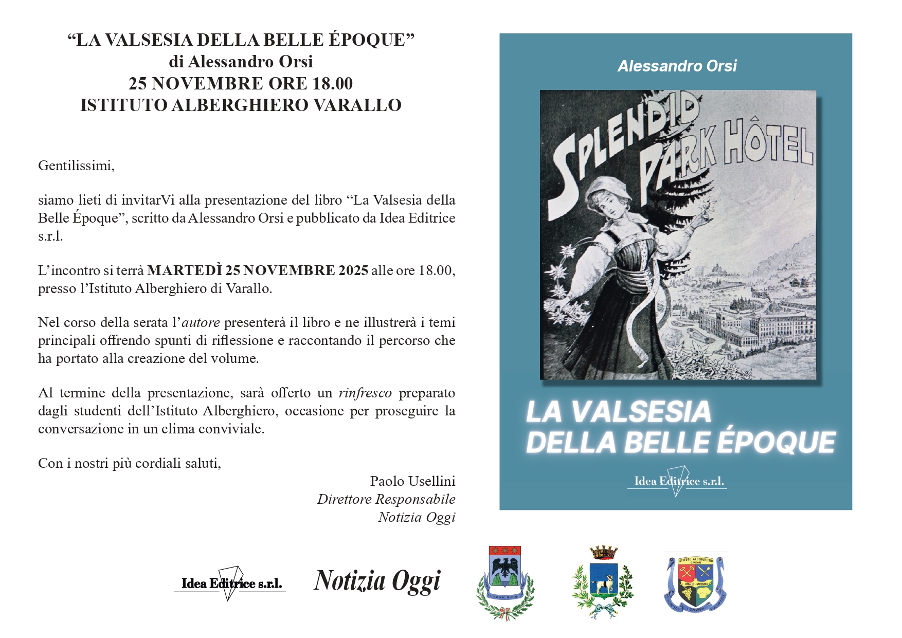 Il 25 novembre alle ore 18.00 a Varallo presso l’Istituto Alberghiero si terrà la presentazione del volume “La Valsesia della Belle Epoque” scritto da Alessandro Orsi. Al termine della presentazione, sarà offerto un rinfresco preparato dagli studenti dell’Istituto Alberghiero, occasione per proseguire la conversazione in un clima conviviale.