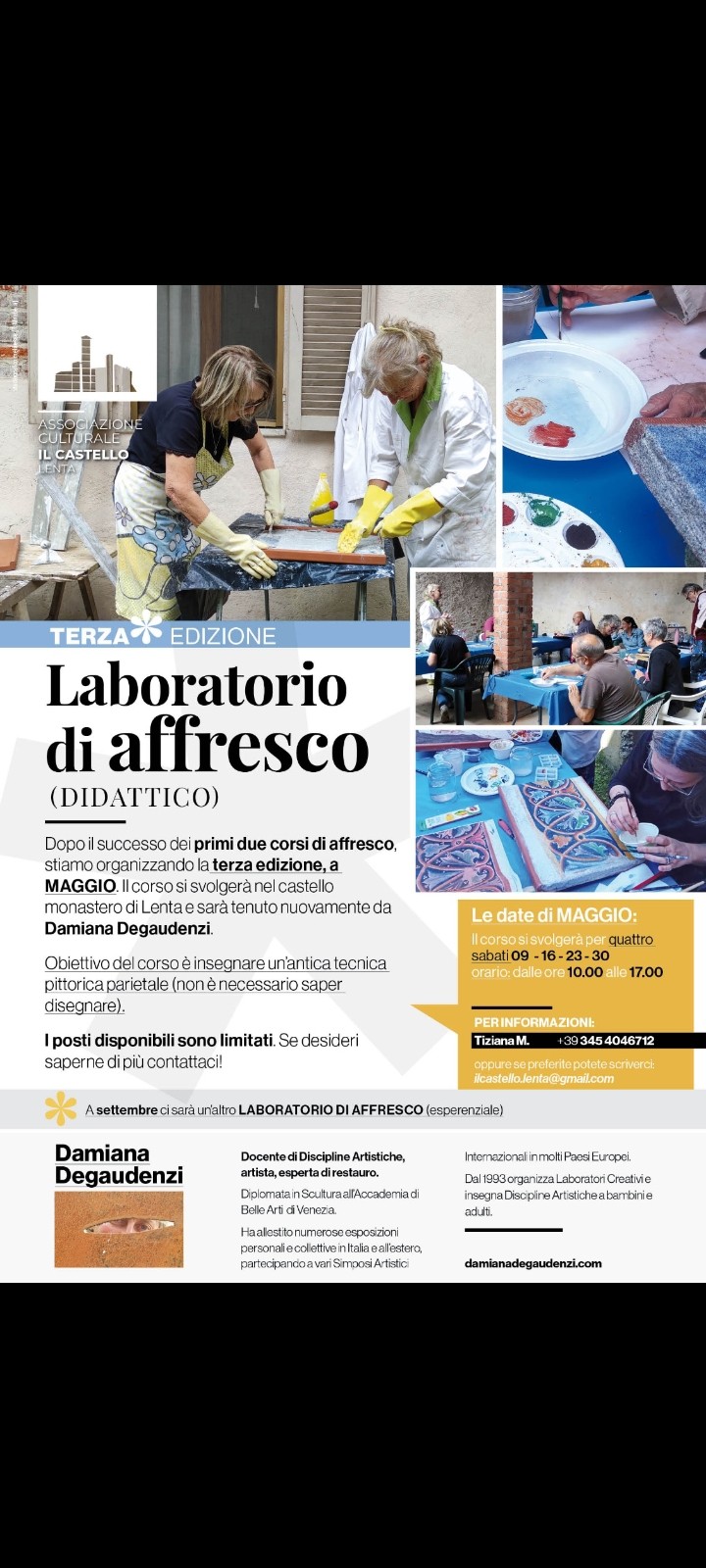 La terza edizione del corso di affresco si svolgerà nel Castello monastero di Lenta e sarà tenuto nuovamente da Damiana Degaudenzi. Obiettivo del corso è insegnare un’antica tecnica pittorica parietale (non è necessario saper disegnare).
