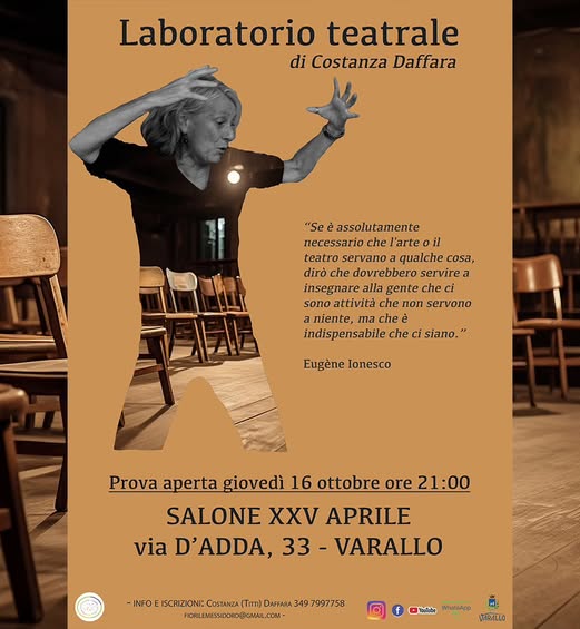 Giovedì 16 ottobre alle ore 21.00 prova aperta del laboratorio teatrale di Costanza Daffara presso il salone XXV Aprile in Via d’Adda 33.