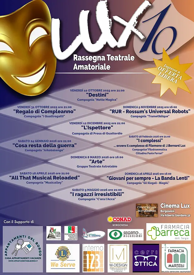 Il Cinema Lux di Borgosesia riapre il sipario per una nuova stagione di teatro amatoriale. Venerdì 12 dicembre quarto spettacolo della rassegna “L’ispettore” della compagnia di posa di Quattordio. Tutti gli spettacoli sono ad ingresso con offerta libera!