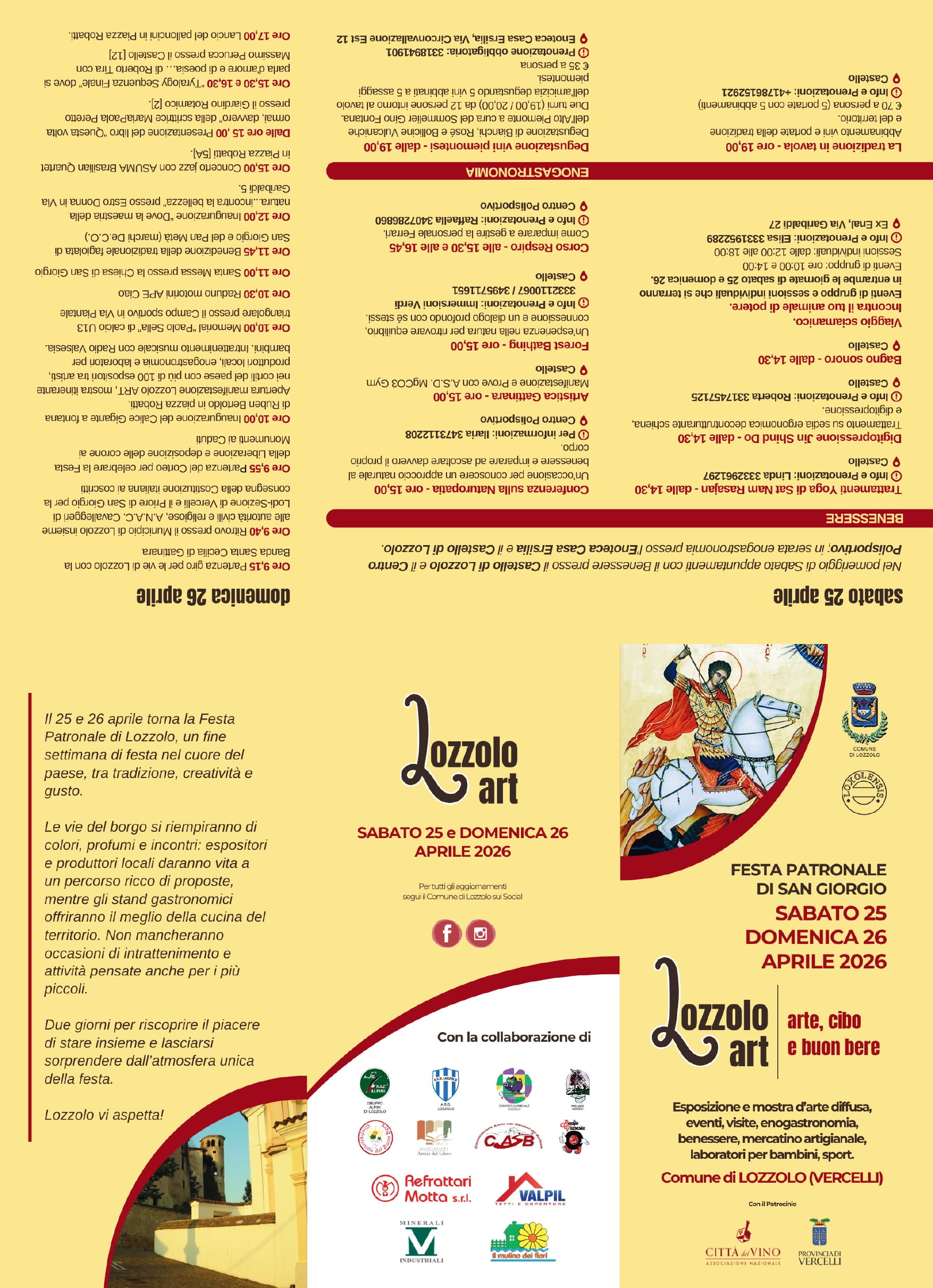 Anche quest’anno la festa patronale di San Giorgio sarà all’insegna della cultura. Tutto è pronto per un fine settimana all’insegna della tradizione, storia, arte, cultura, enogastronomia, benessere e famiglia. La tradizionale Festa Patronale sarà ampliata con LozzoloART: l’appuntamento è fissato per sabato 25 e domenica 26 aprile, con un programma itinerante in tutto il centro storico, che vede interessati 12 cortili, più di 60 hobbisti lungo le vie, 10 laboratori per bambini, street food, 20 associazioni di volontariato e ben 35 artisti tra cui Antonio Toma e Piero Motta. Al mattino di domenica 26 aprile si svolgerà anche la celebrazione della “Festa della Liberazione” con il consueto programma: le priore di San Giorgio insieme alla Banda Santa Cecilia di Gattinara, alle autorità, al parroco Don Renzo, renderanno omaggio ai monumenti ai caduti ed a seguire la benedizione della tradizionale fagiolata e del pan metà