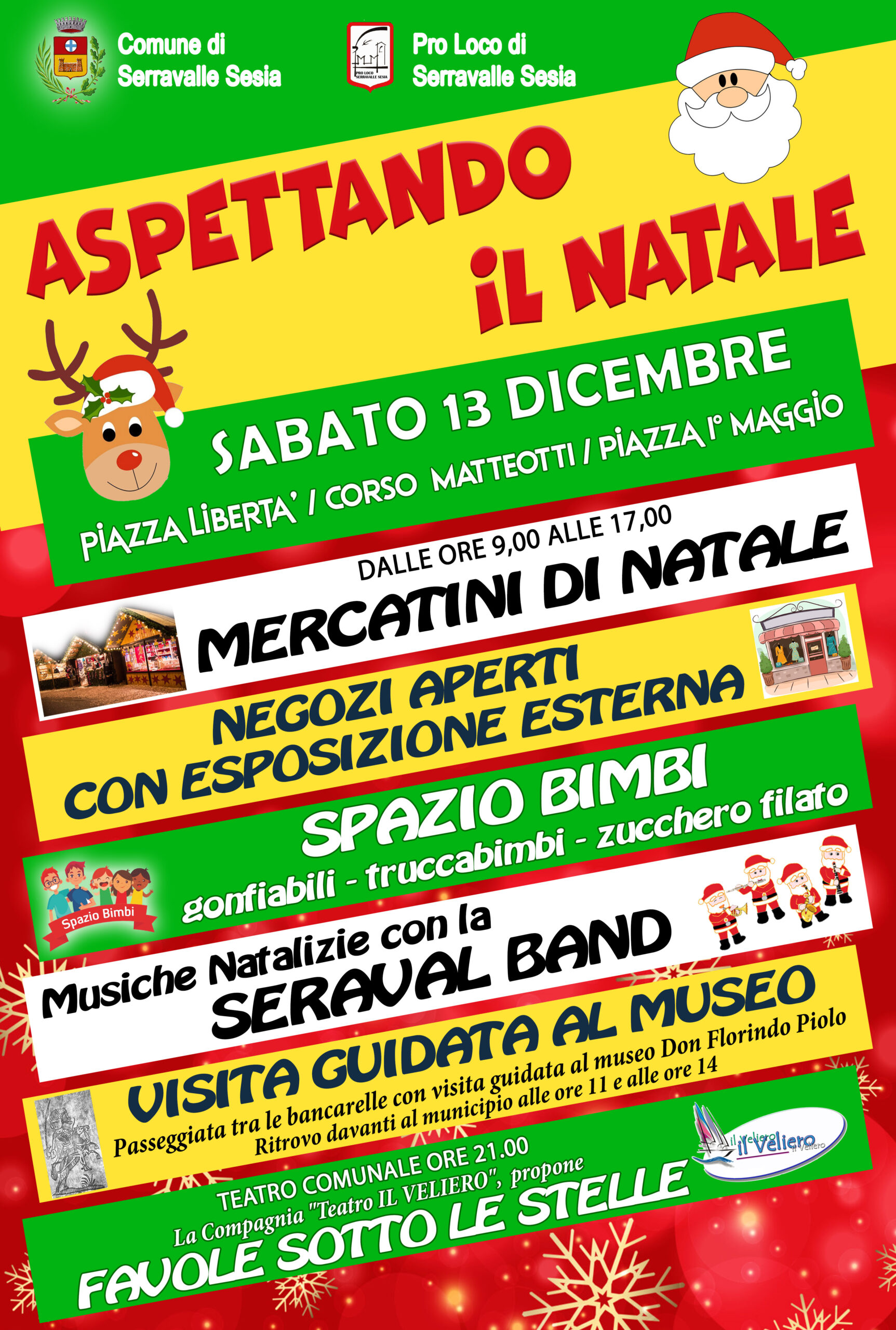 Sabato 13 dicembre 2025 dalle 9 alle 17 in Piazza Libertà, Corso Matteotti e Piazza Primo Maggio banchetti a tema natalizio, negozi aperti con esposizione esterna, spazio bimbi, Musiche Natalizie con la Seraval Band, Visita guidata al Museo. In serata verrà proposto “Favole Sotto le Stelle” della Compagnia Teatro Il Veliero. Presso Teatro Comunale ore 21