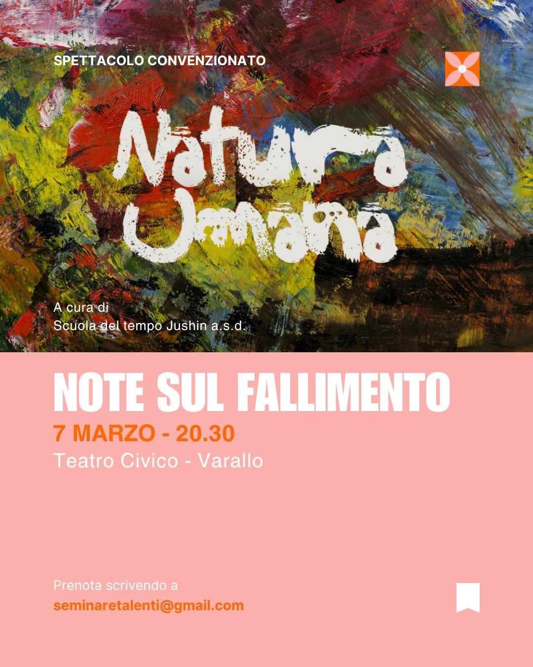 Sabato 7 marzo presso il teatro civico di Varallo spettacolo “Natura umana, note sul fallimento” a cura di Scuola del tempo Jushin a.s.d.; lo spettacolo è inserito all’interno di un ciclo di appuntamenti teatrali pensati per ragazzi e ragazze, con l’idea di usare il palcoscenico come spazio di confronto su futuro, scelte, possibilità e anche sul tema del fallimento.
