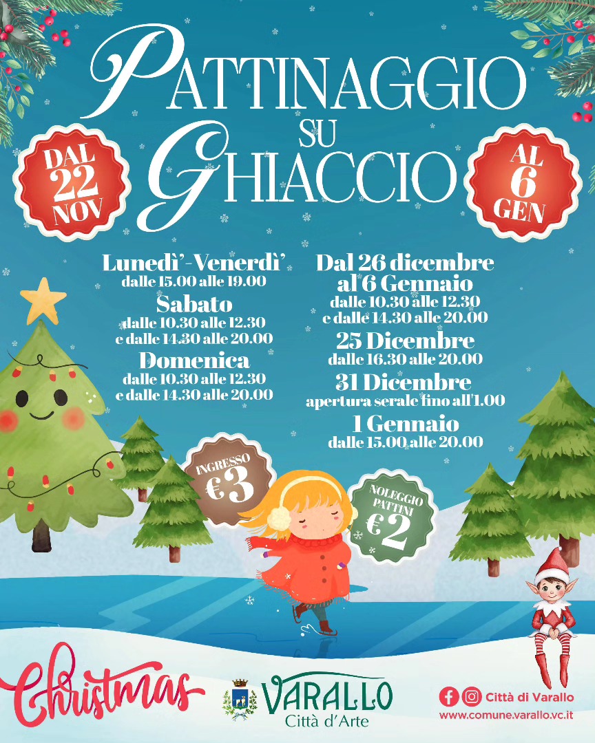 A Varallo dal 22 novembre al 6 gennaio sarà aperta la pista di pattinaggio in piazza Vittorio con i seguenti orari: lunedì – venerdì dalle 15.00 alle 19.00, sabato e domenica dalle 10.30 alle 12.30 e dalle 14.30 alle 20.00. Dal 26 dicembre al 6 agennaio dalle 10.30 alle 12.30 e dalle 14.30 alle 20.00, il 25 dicembre dalle 16.30 alle 20.00, il 31 dicembre apertura serale fino all’1 e il primo gennaio dalle 15.00 alle 20.00.