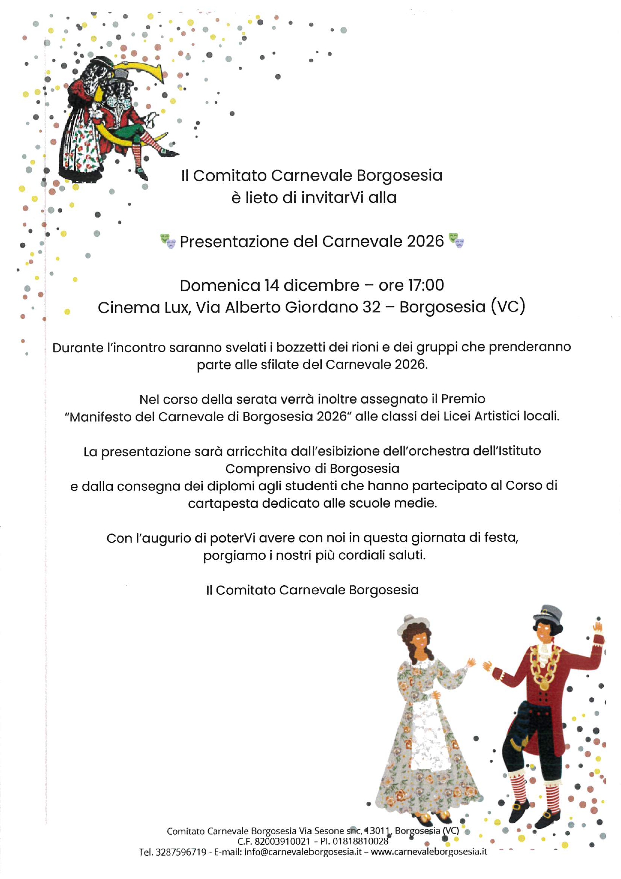 Domenica 14 dicembre alle ore 17.00 presso il cinema Lux di Borgosesia, si terrà la presentazione del Carnevale 2026. Durante l’incontro saranno svelati i bozzetti dei rioni e dei gruppi che prenderanno parte alle sfilate del Carnevale 2026.