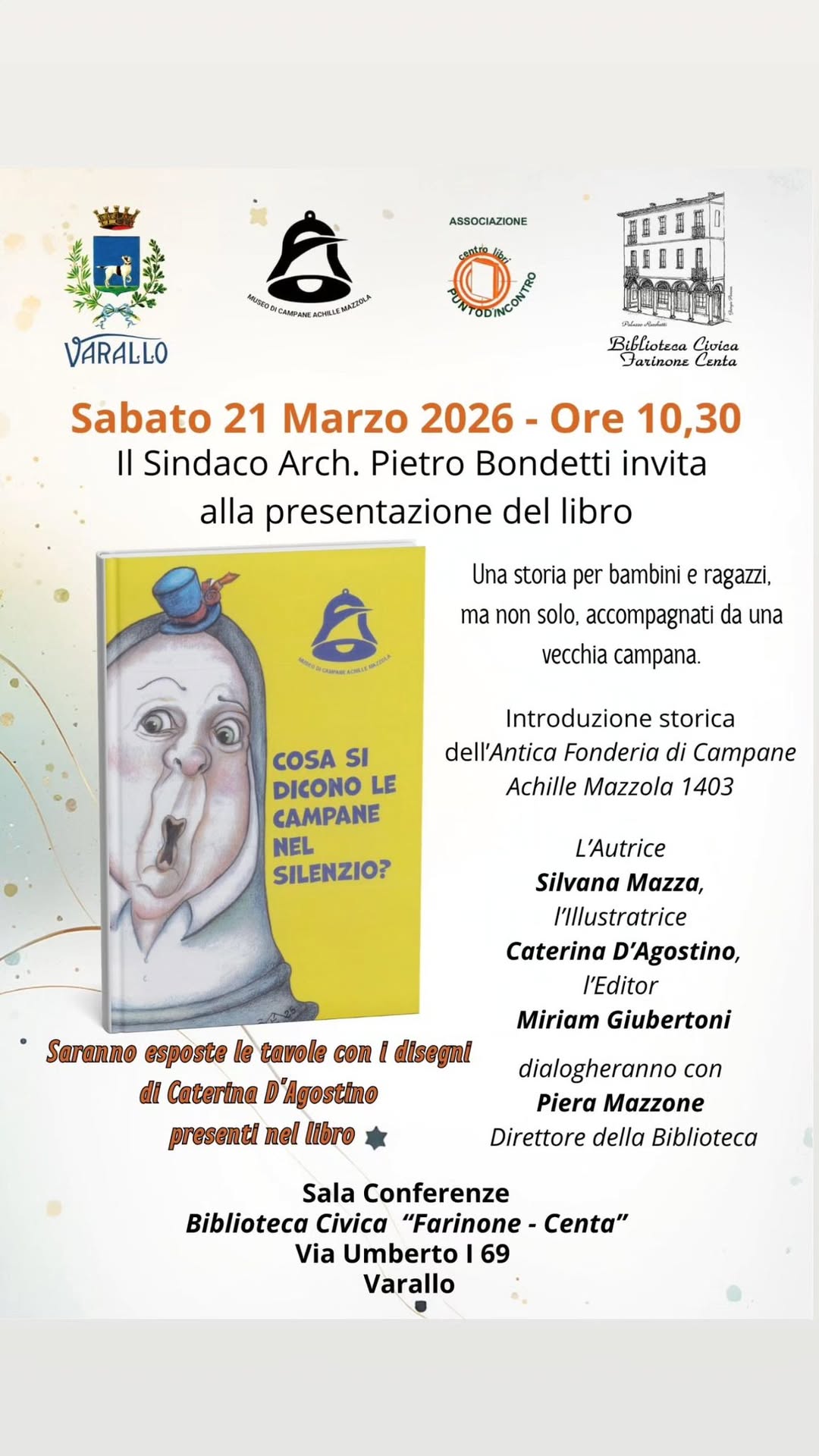 Sabato 21 marzo alle ore 10.30 presso la sala conferenze della Biblioteca Civica “Farinone Centa” di Varallo, si terrà la presentazione del libro “Cosa si dicono le campane nel silenzio“, una storia per bambini e ragazzi ma non solo, accompagnati da una vecchia campana. Introduzione storica dell’Antica fonderia di campane Achille Mazzola 1403. Saranno esposte le tavole con i disegni di Caterina d’Agostino presenti nel libro.