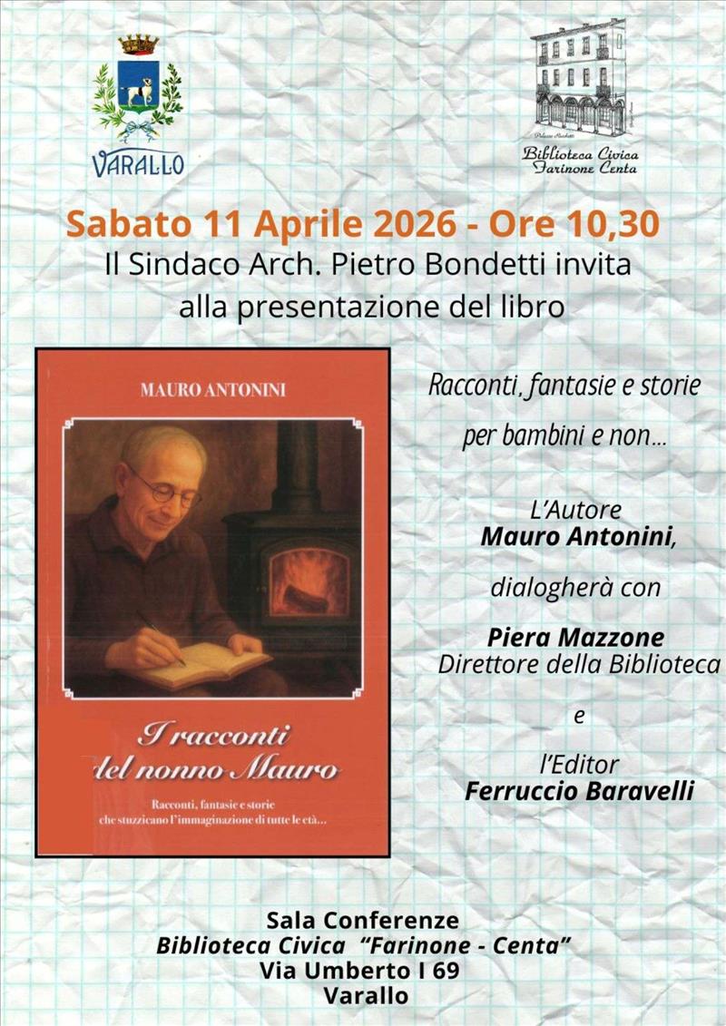 Sabato 11 aprile alle ore 10,30 presso la Sala conferenze della Biblioteca civica di Varallo, si terrà la presentazione del libro “I racconti del nonno Mauro”: racconti, fantasie e storie per bambini e non…l’autore Mauro Antonini dialogherà con Piera Mazzone e l’Editor Ferruccio Baravelli.