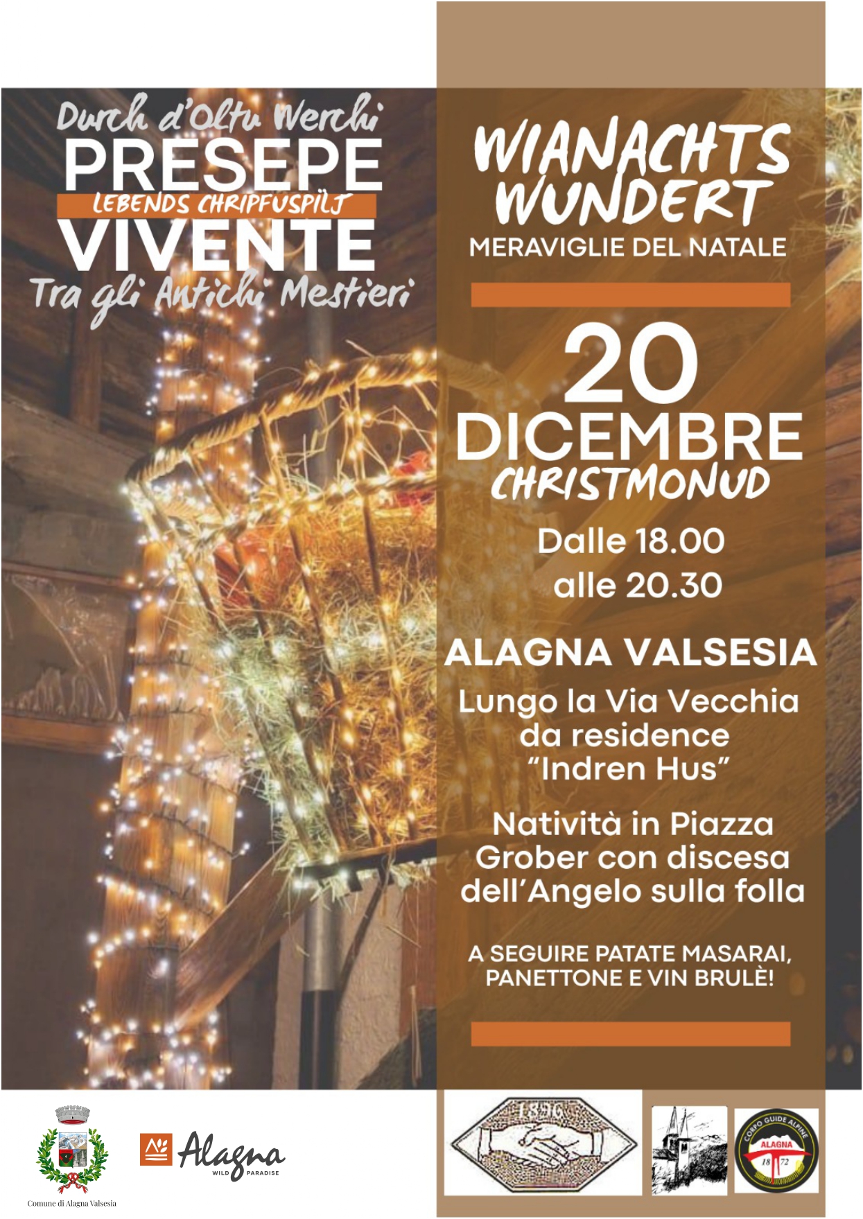 Sabato 20 dicembre ad Alagna tornerà il Presepe Vivente organizzato da Associazione Unione Alagnese. L’evento si svolgerà dalle 18.00 alle 20.30 lungo la stradina vecchia pedonale di Pedelegno e terminerà in Piazza Grober con discesa dell’Angelo sulla folla. A seguire patate masarai, panettone e vin brulè.