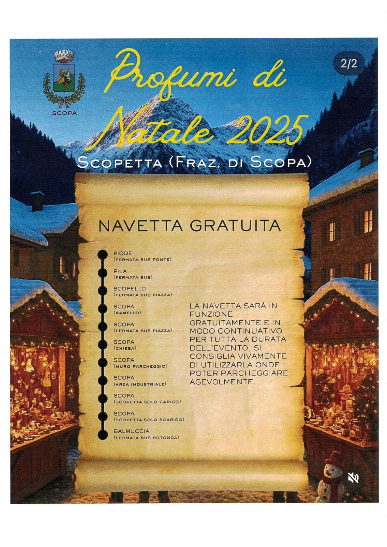 Per le vie del paese mercatini hobbisti e stand gastronomici. Navetta gratuita da Scopa e paesi limitrofi.