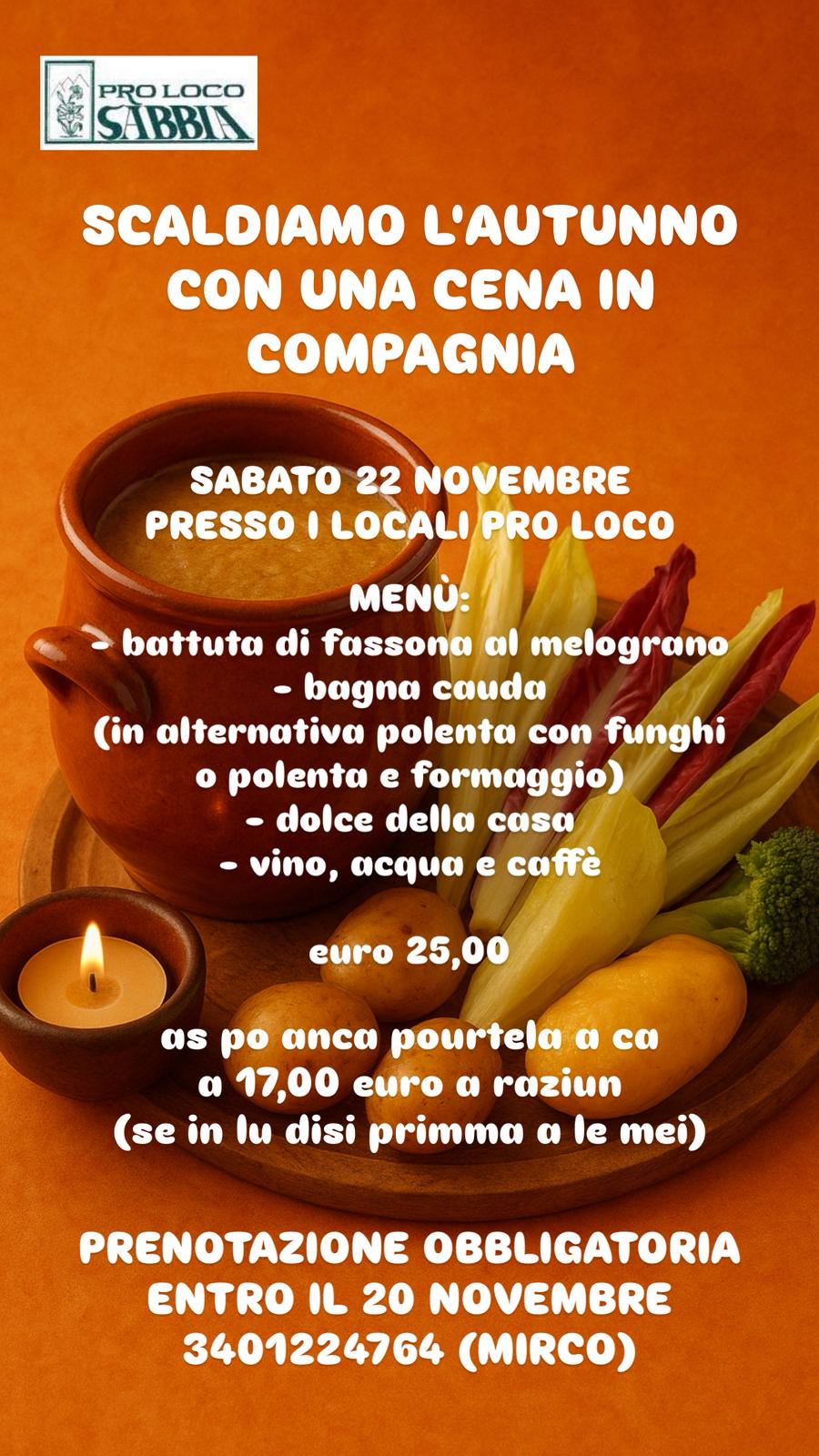 Alle ore 20 cena autunnale in compagnia presso i locali Pro Loco. Prenotazione obbligatoria entro il 20/11