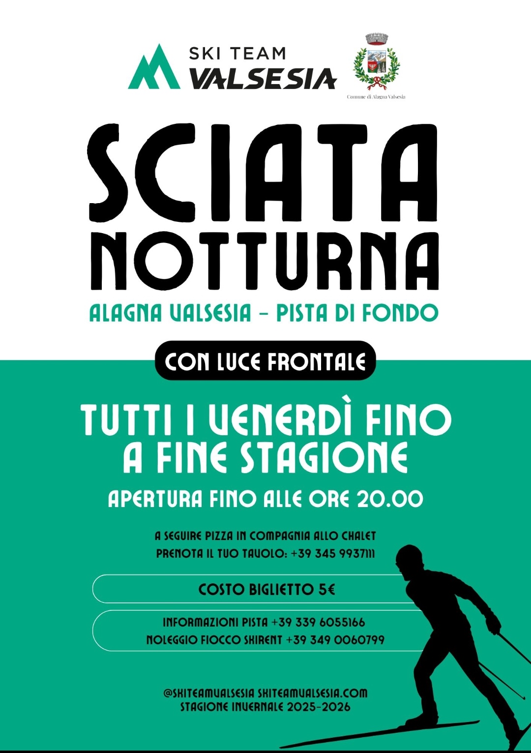 Venerdì 27 marzo sciata notturna presso la pista di fondo di Riva Valdobbia. Apertura fino alle 20.00, portare la luce frontale. A seguire pizza in compagnia allo chalet. Per prenotare il tavolo 3459937111.