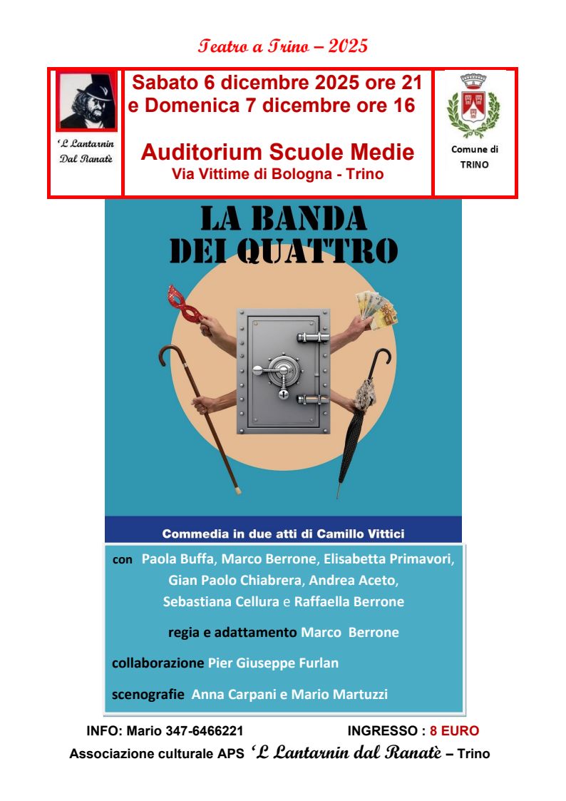 Sabato 6 dicembre ore 21 e domenica 7 dicembre ore 16, lo spettacolo “La Banda dei Quattro” di Camillo Vittici, presso l’Auditorium Scuole Medie di Trino.
