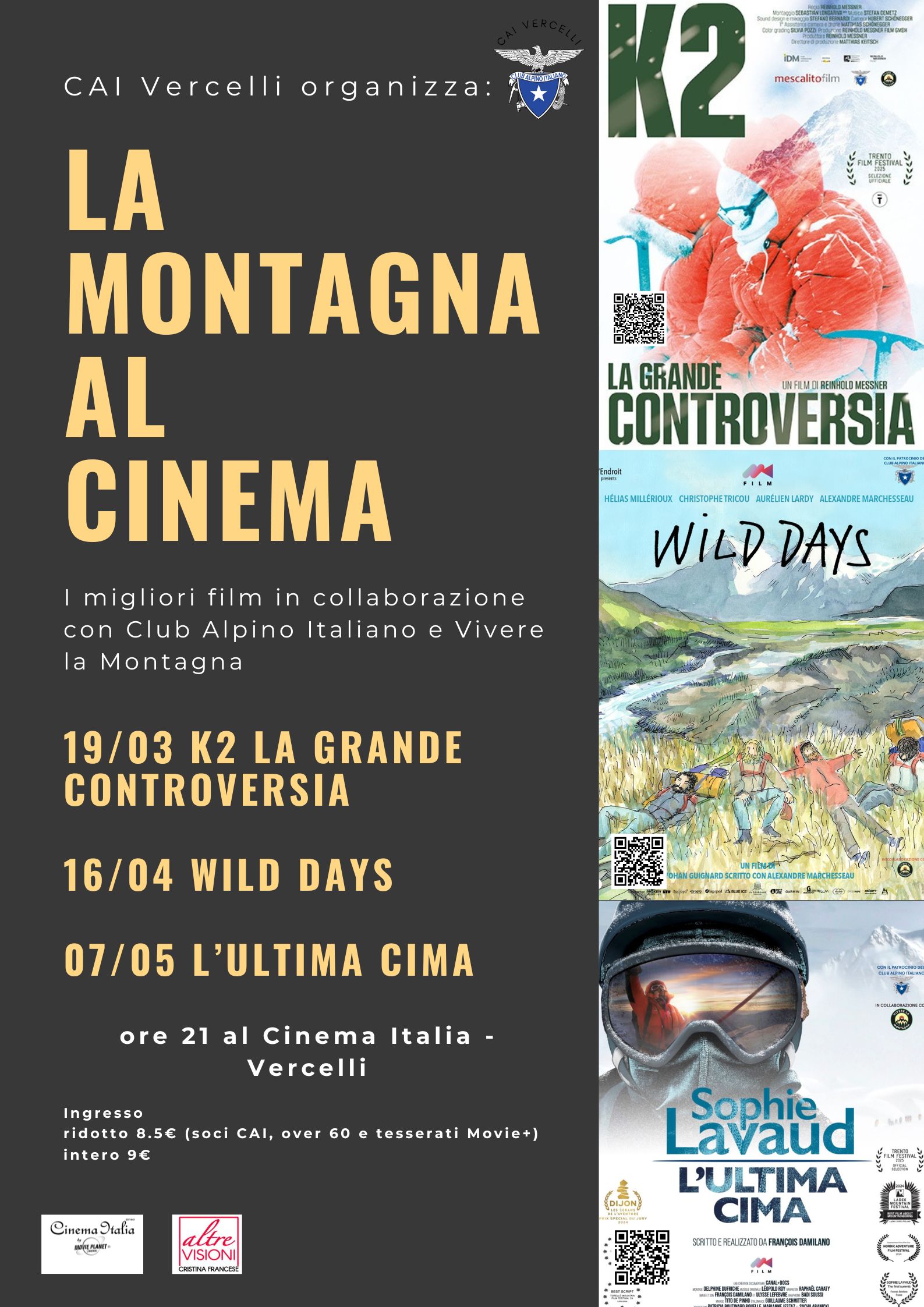 La rassegna cinematografica è aperta a soci e non soci del CAI Vercelli. Biglietto intero: 9 euro, biglietto ridotto 8,50 euro (riservato ai soci CAI, over 60 e tesserati MOVIE+