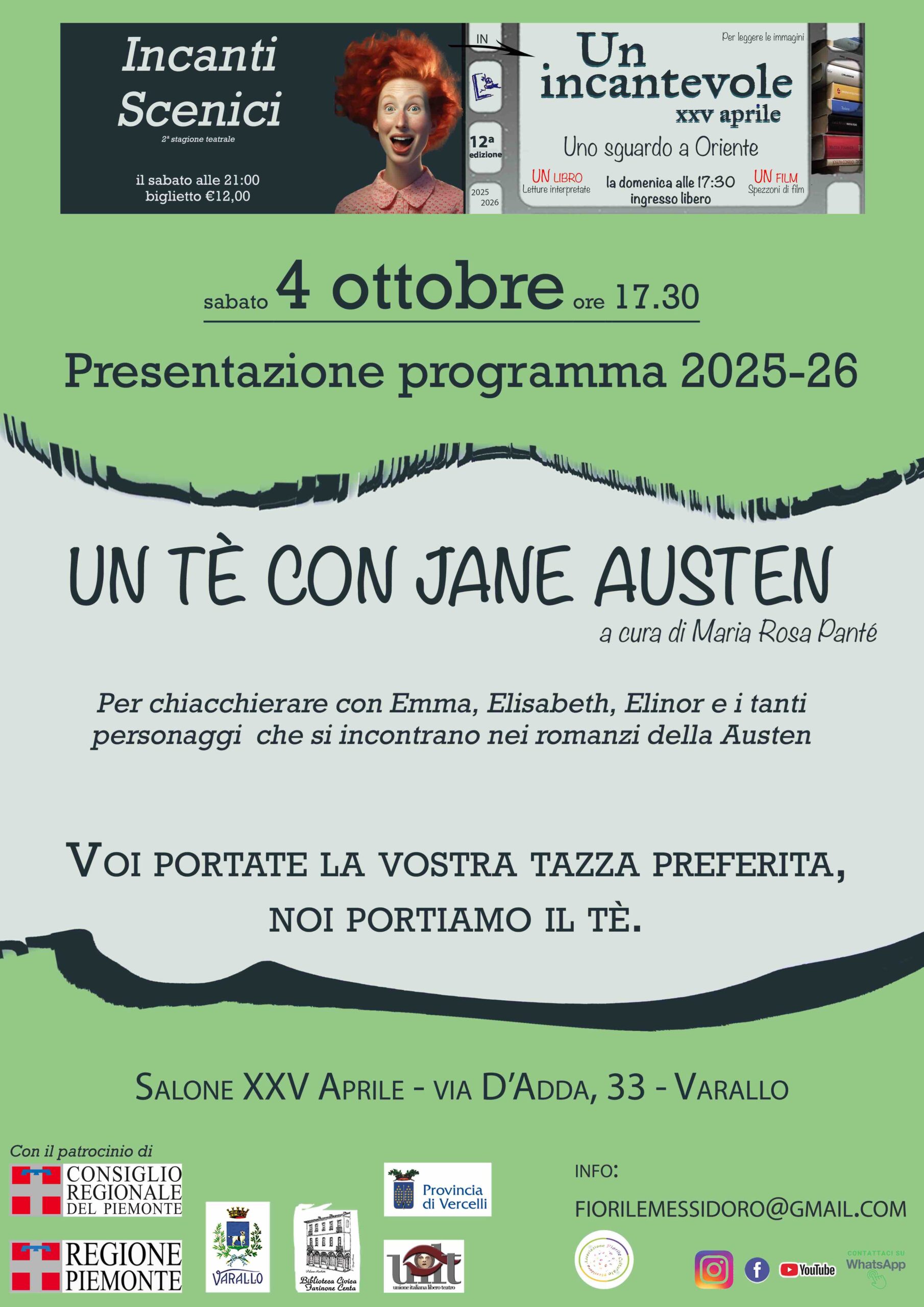 Sabato 4 ottobre alle ore 17.30- ingresso libero. Serata di presentazione del programma “Incanti Scenici in Un incantevole XXV Aprile” dal titolo Un tè con Jane Austen – si parlerà di Jane Austen, a cura di Maria Rosa Panté.