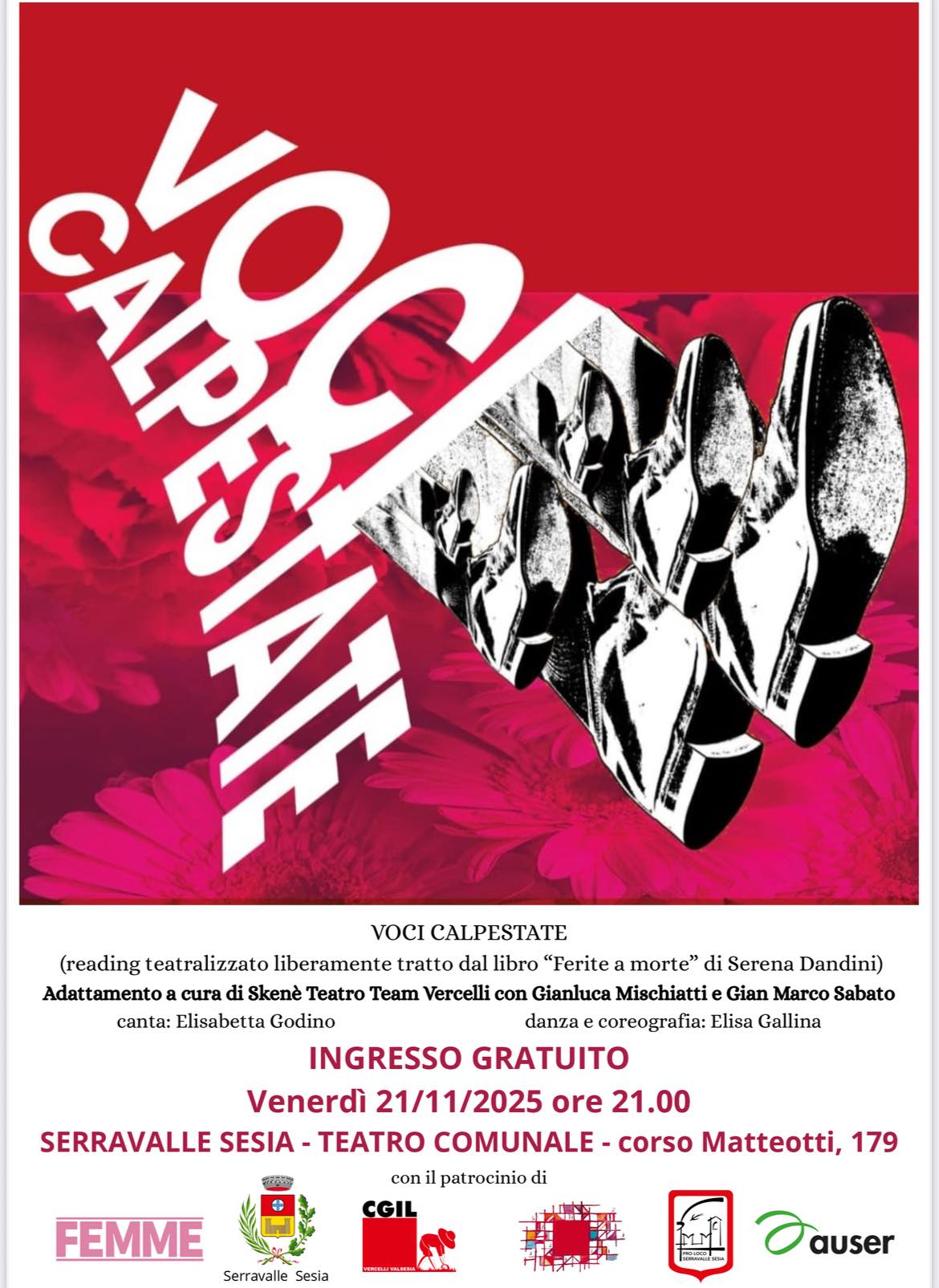 Venerdì 21 novembre alle ore 21.00 presso il Teatro Comunale di Serravalle andrà in scena lo spettacolo “Voci calpestate”: reading teatralizzato liberamente tratto dal libro “Ferite a morte” di Serena Dandini, adattamento a cura di Skenè Teatro Team Vercelli con Gianluca Mischiatti e Gian Marco Sabato. Canta Elisabetta Godino, danza e coreografia Elisa Gallina. Ingresso gratuito.
