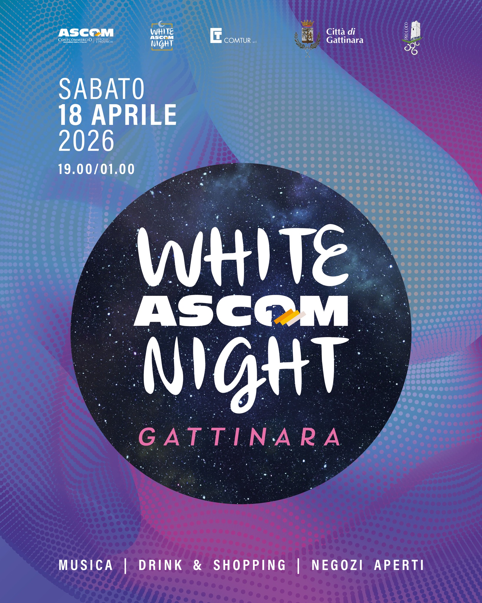 Sabato 18 aprile, torna la NOTTE BIANCA – WHITE ASCOM NIGHT a Gattinara. Dalle 19.00 all’1.00 sarà una notte magica tra musica e sapori nel centro cittadino, dall’aperitivo a mezzanotte con musica nei bar, negozi aperti per lo shopping serale, drink e street food.