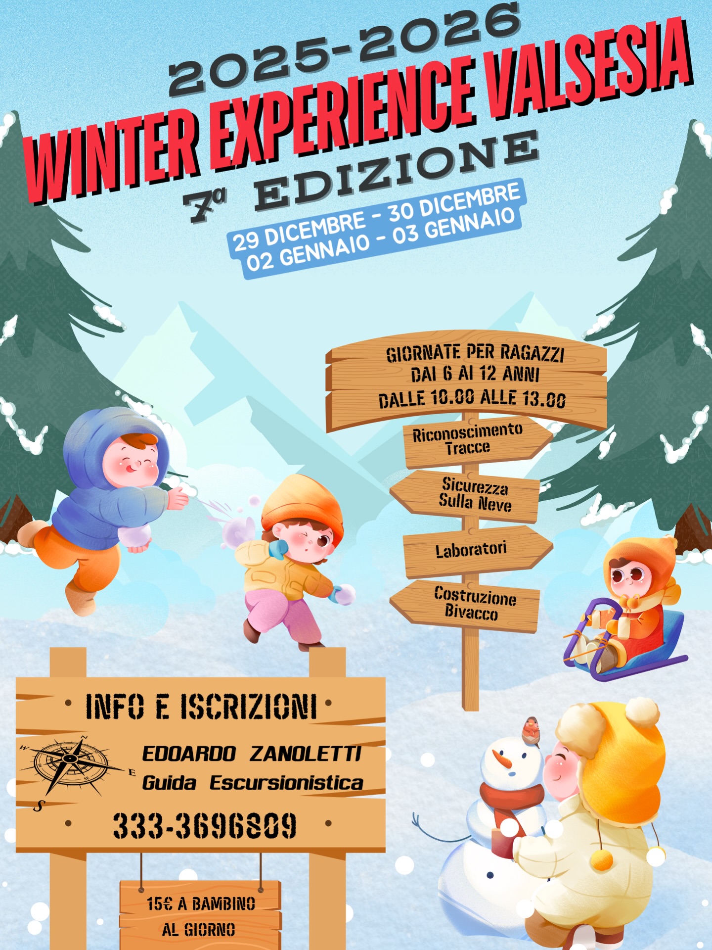 Quest’inverno avrà luogo la 7ª edizione della WINTER EXPERIENCE VALSESIA dedicata ai ragazzi dai 6 ai 12 anni con varie attività divertenti ed educative: ricerca e riconoscimento tracce animali, costruzione igloo, gara di pupazzi di neve, simulazione di soccorso sulla neve, costruzione bivacco di emergenza e tante altre attività! Orario delle attività: dalle 10.00 alle 13.00 Luogo: Alagna Valsesia – località Riva Valdobbia zona Chalet pista di fondo. Le attività verranno adeguate al livello del manto nevoso presente.