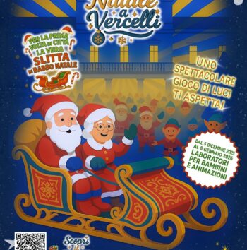 A Vercelli, numerosi eventi in occasione del Natale 2025: Impianto di filodiffusione con musiche natalizie in città, dal 6 dicembre, Illuminazione e videomapping su Palazzo di città, Attività per bambini presso la biblioteca ragazzi e ludoteca di via Galileo Ferraris, Pista di pattinaggio in Piazza Antico Ospedale, Mercati straordinari natalizi Domenica 14 dicembre e domenica 21 dicembre. Il programma dettagliato: