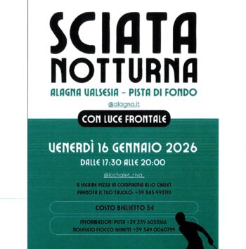 Venerdì 16 gennaio dalle 17.30 alle 20.00 sciata notturna presso la pista di fondo di Riva Valdobbia. Portare la luce frontale. A seguire pizza in compagnia allo chalet. Per prenotare il tavolo 3459937111. Info: Informazioni pista: 3396055166 – Noleggio Fiocco Skirent: 3490060799