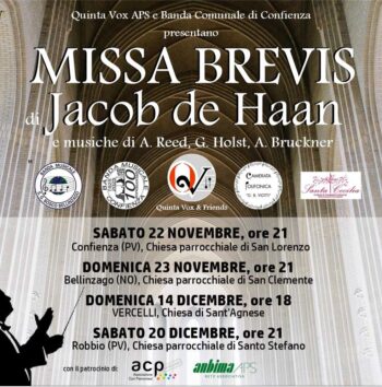 Domenica 14 dicembre alle 18, presso la chiesa di S.Agnese a Vercelli, “Missa brevis di Jacobde Haan” e musiche di A.Reed, G.Holst, A.Bruckner con il coro Quinta Vox e la Banda Comunale di Confienza.