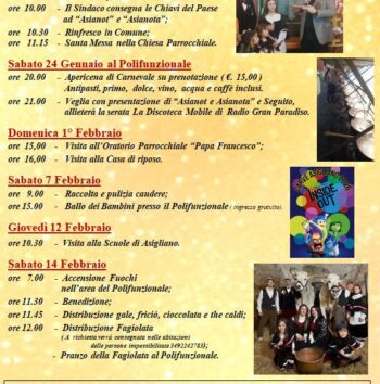 Sabato 21 febbraio a Scopello alle ore 20,00 sarà organizzata la cena delle ossette presso il centro Polifunzionale e a seguire ballo mascherato dalle 22.00. Informazioni e prenotazioni: 3792738007 per prenotazione della cena
