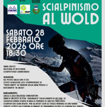I Lupi di Mera sciano in branco nelle notti di luna piena. Un gruppo di appassionati si dà appuntamento serale una volta al mese per salire in montagna con le pelli di foca o con le ciaspole. L’evento denominato “Lupi di Mera” si svolge durante la sera sulle piste da sci dell’Alpe di Mera, in orario di chiusura al pubblico. Ritrovo: Alpe Trogo alle ore 18.30. Occorre prenotare online tramite il link che verrà comunicato.