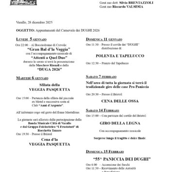 Domenica 15 febbraio preparazione e distribuzione della tradizionale paniccia di Varallo Vecchio (Dughi), Crevola, Roccapietra, Locarno, Sabbia e Morca (al pomeriggio). Info: carnevalevarallo@gmail.com