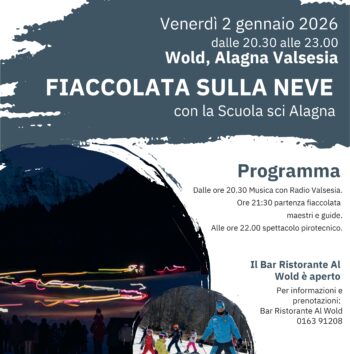Difficoltà facile, adatto a tutta la famiglia. Durata della camminata breve, 20 minuti a piedi per un dislivello di 80 m, durata della visita guidata 60 minuti circa.Per partecipare è obbligatorio indossare un abbigliamento e calzature adeguati alla quota e adatti ad affrontare il percorso sulla neve, l’utilizzo di ramponcini è fortemente consigliato. Verificare il giorno prima presso l’ufficio turistico di Alagna se sono necessari ciaspole o ramponcini. Prenotazione obbligatoria entro le 16.00 del giorno precedente via mail all’indirizzo consorzioturisticoalagna@gmail.com o telefonicamente al numero 0163 922988.Info: Ufficio Turistico di Alagna 0163.922988