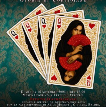 Domenica 16 novembre ore 16: REGINE DI CUORI. Storie di cortigiane. Evento teatralizzato a cura di Letizia Vercellino. Prenotazione OBBLIGATORIA allo 0161.253204 fino a venerdì ore 12.30; 379.2834818 venerdì pomeriggio e sabato; info@museoleone.it.