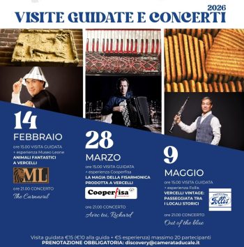 Sabato 9 maggio alle ore 15.00, visita guidata “Vercelli vintage: passeggiata tra i locali storici”, tour tematico con visita a Pasticceria Follis. Alle ore 21 al Teatro Civico concerto “Out of the blue” con ALESSANDRO CARBONARE corno di bassetto, GUIDO RIMONDA direttore e ORCHESTRA CAMERATA DUCALE