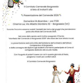 Domenica 14 dicembre alle ore 17.00 presso il cinema Lux di Borgosesia, si terrà la presentazione del Carnevale 2026. Durante l’incontro saranno svelati i bozzetti dei rioni e dei gruppi che prenderanno parte alle sfilate del Carnevale 2026. Info: Pagina facebook Carnevale di Borgosesia