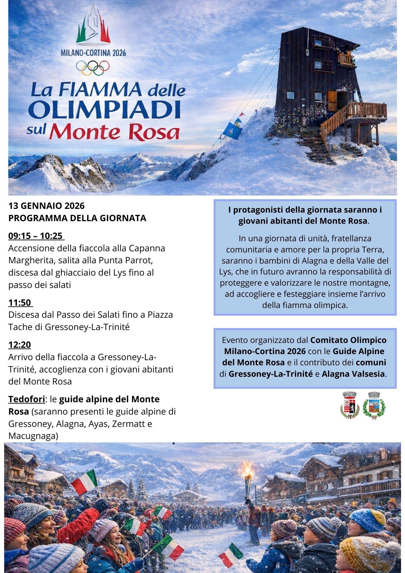 Al centro dell’evento ci saranno i giovani del Monterosa. Settanta bambini di Alagna, accompagnati dai rappresentanti della comunità Walser Alagnese, attraverseranno il Passo dei Salati in funivia per accogliere, insieme ai 150 bambini della Valle del Lys, l’arrivo della fiaccola in paese.